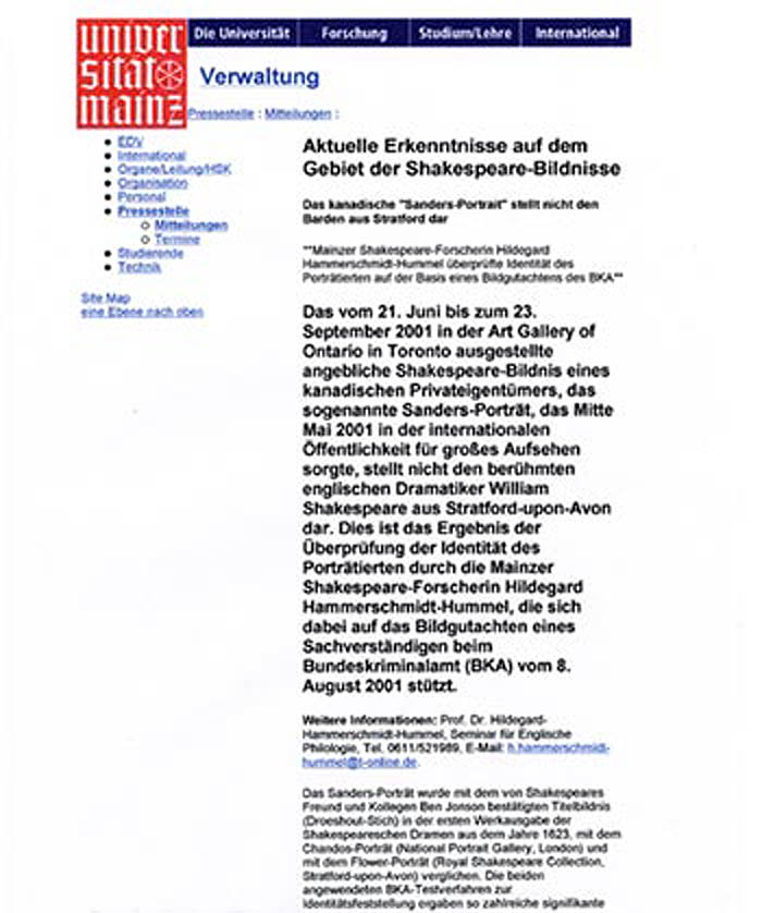 Frau Sabin prangert zu Beginn ihrer Besprechung die (deutsche) “Shakespearomanie und Idolatrie” an, die “ständig neuen Veröffentlichungen ... biographischen Spekulationen” usw. - um sie dann selber ausführlich zu schüren. ... Von “ewigen Rätseln” zu phantasieren ist stets bequemer als in Knochenarbeit diese Rätsel aufzulösen zu versuchen - als ob über Shakespeare und seine Zeit nichts bekannt wäre. - Frau Sabin sollte wohl bekannt sein, dass einer ‘nahen’ Kollegin von ihr, nämlich der Mainzer Shakespeare-Forscherin Prof. Hildegard Hammerschmidt-Hummel, in den letzten Jahren auf Grund von Indizien (Dokumente und Bilder) die entscheidenden Entdeckungen über das Rätsel Shakespeare gelungen sind. So gelang es ihr, mit stringenten wissenschaftlichen Methoden, welche in der Kriminalistik üblich sind, die Übereinstimmung und damit Authentizität der ganz wenigen zeitgenössischen Shakespeare-Bildnisse objektiv zu erhärten. Nach diesen Befunden gehört das soeben in Kanada aufgetrauchte Sanders-Portrait eindeutig nicht dazu. Somit ist das von Frau Sabin vor drei Wochen ausführlich gewürdigte Buch “Shakespeare’s face” ziemlich wertlos; sie beklagt sich völlig mit Recht über die nicht abreissenden, unnötigen Spekulationen - die sie selber anheizt.