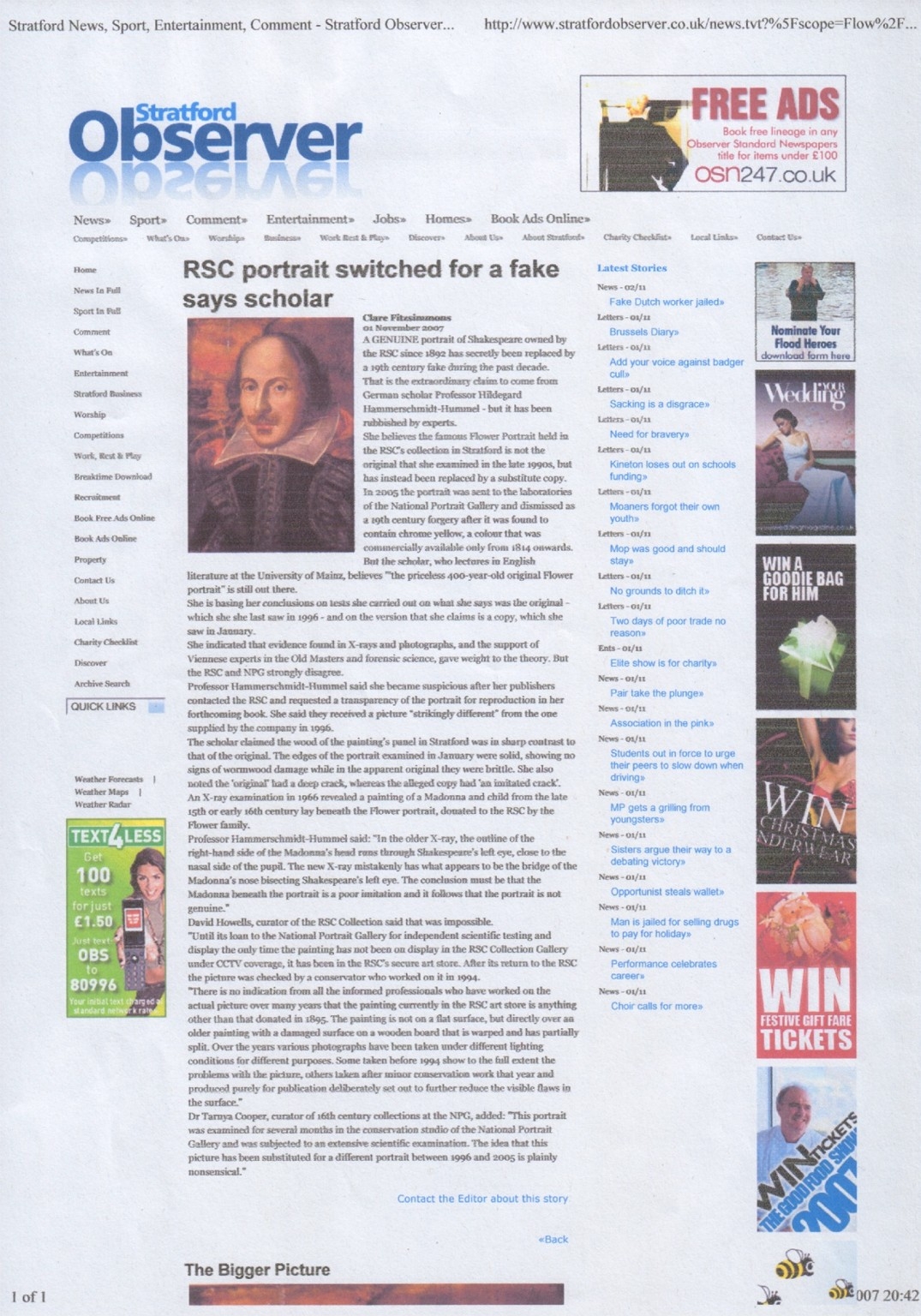 Clare Fitzsimmons, 'RSC portrait switched for a fake says scholar', Stratford Observer (1 November 2007). |